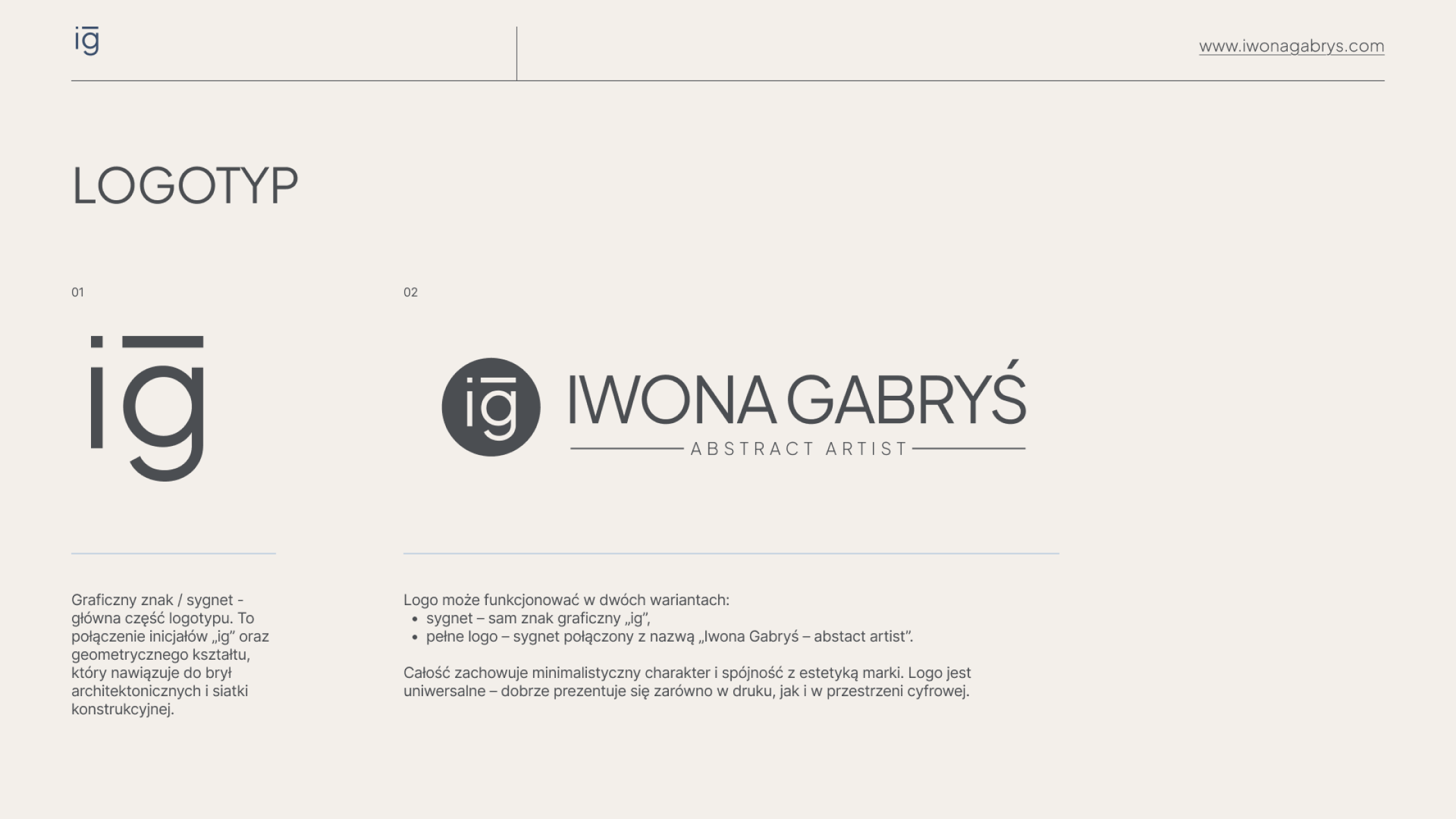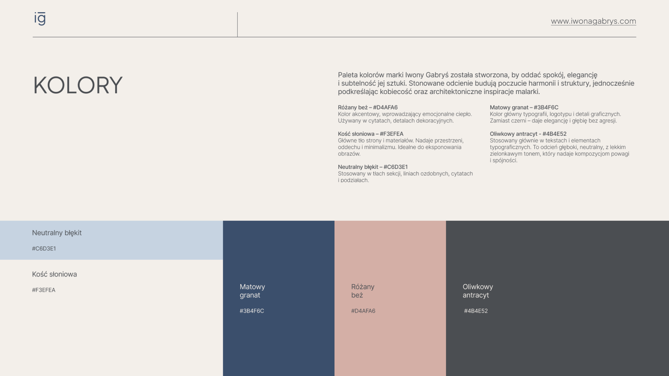 Efekt: materiały (strona www, PDF oferty, grafiki do postów) przestały „krzyczeć”. To obrazy prowadzą, identyfikacja je wspiera. Powstał spójny system, który ułatwia przygotowanie treści i zachowuje ten sam spokojny ton. Zrobiłyśmy krok w tył – po to, żeby na pierwszy plan mogła wyjść sztuka Iwony.